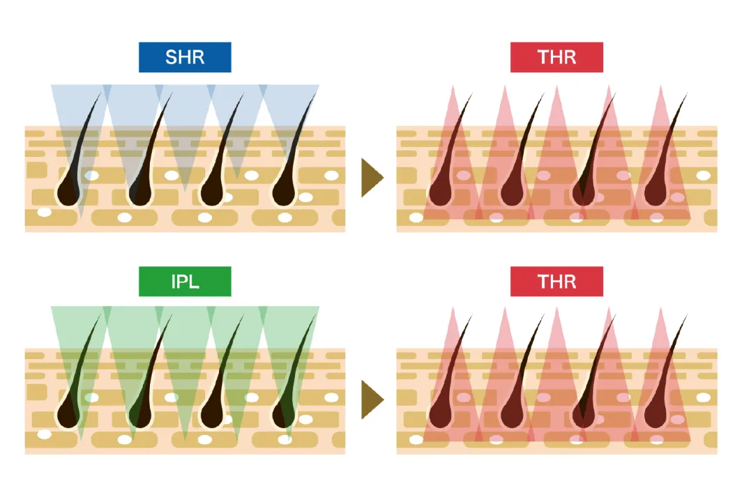 THR方式は、IPL方式の「抜けの良さ」とSHR方式の「お手入れの早さ」を組み合わせた脱毛法です。赤外線領域を活用した浸透力の高い波長で、肌に優しく、毛にはしっかりと効果を発揮します。