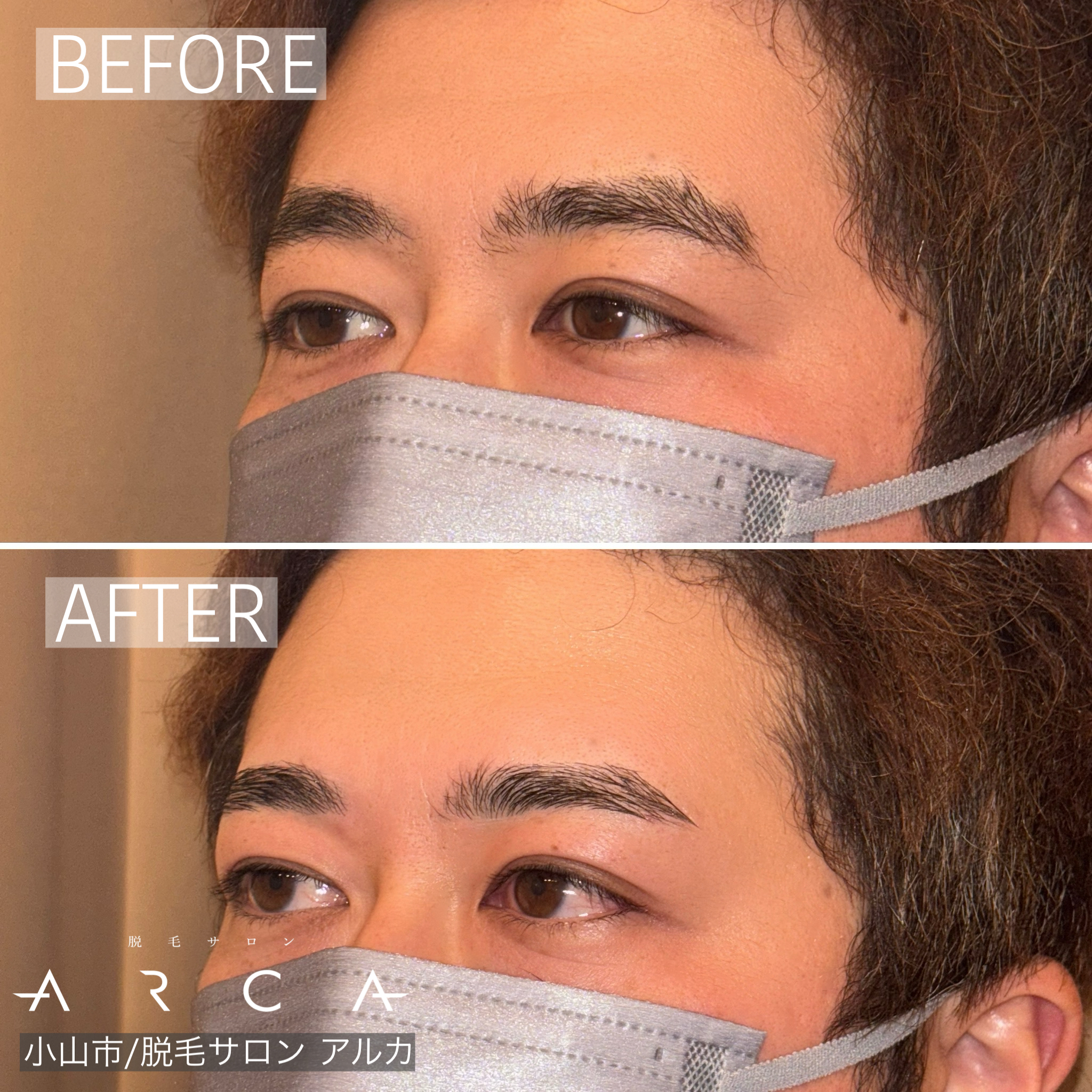 元々は毛流れが上向きに生えやすく、毛が太く見えやすい状態でした。また、毛の重なりによって濃さにばらつきが出ており、全体的に下がった印象の眉毛でした。