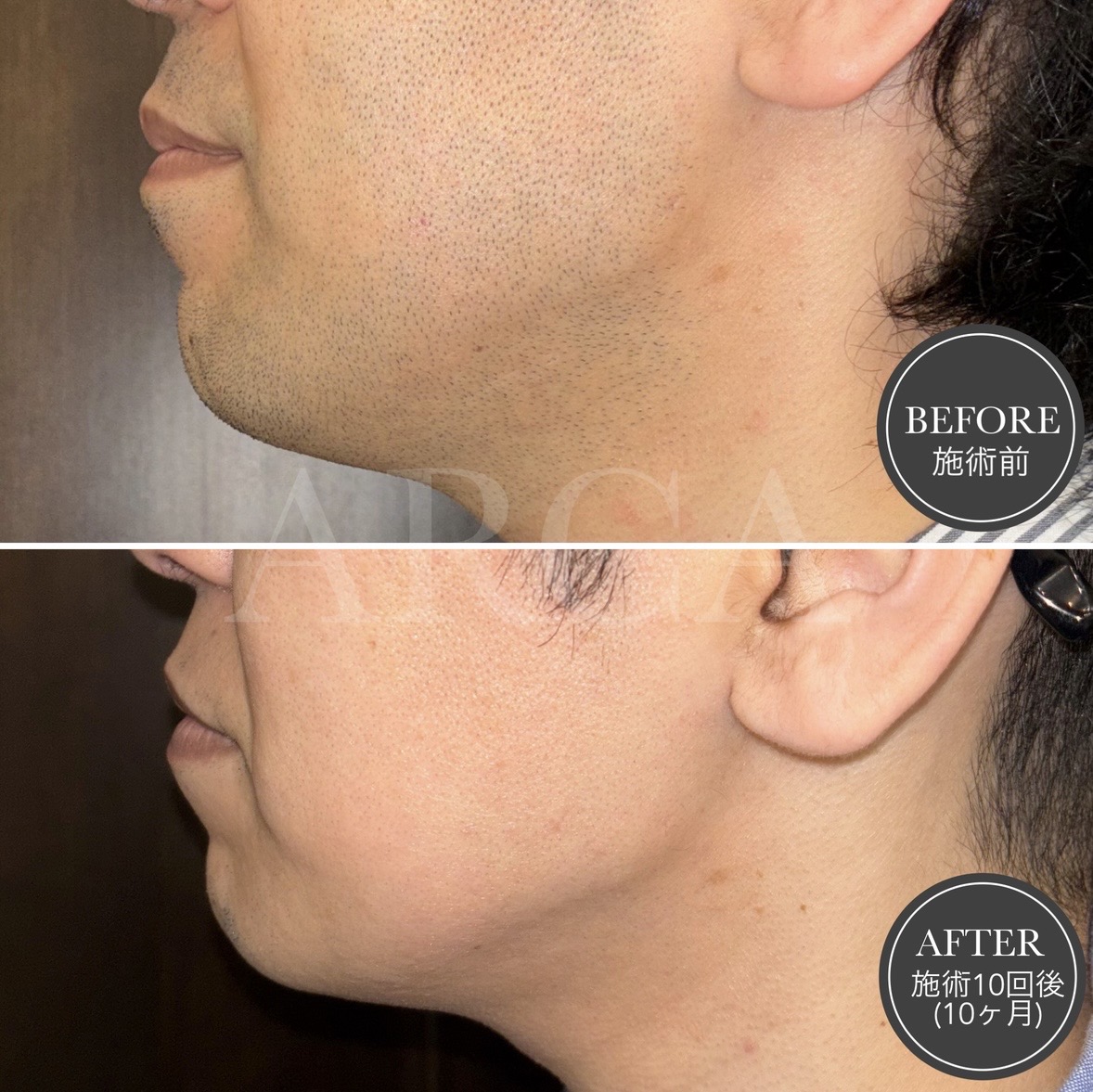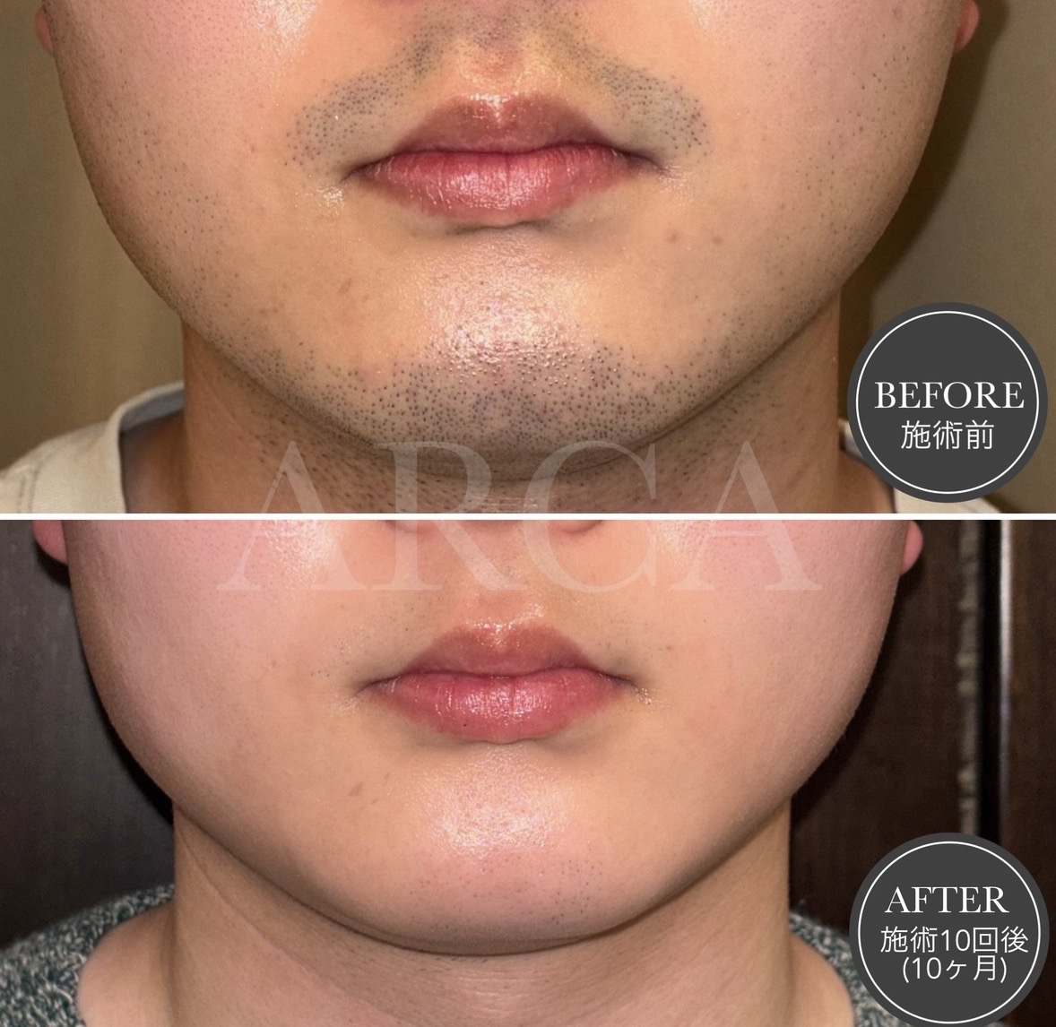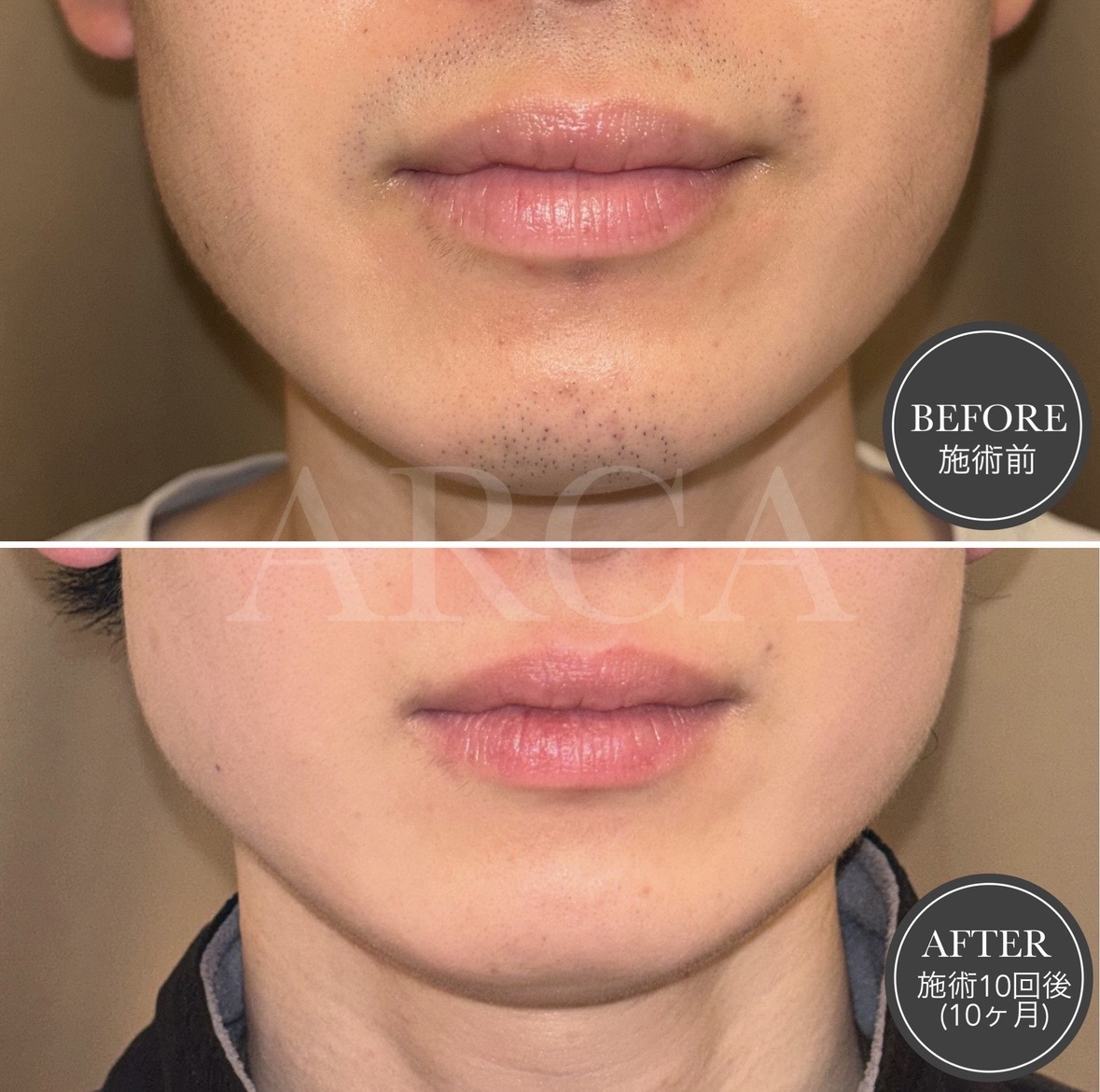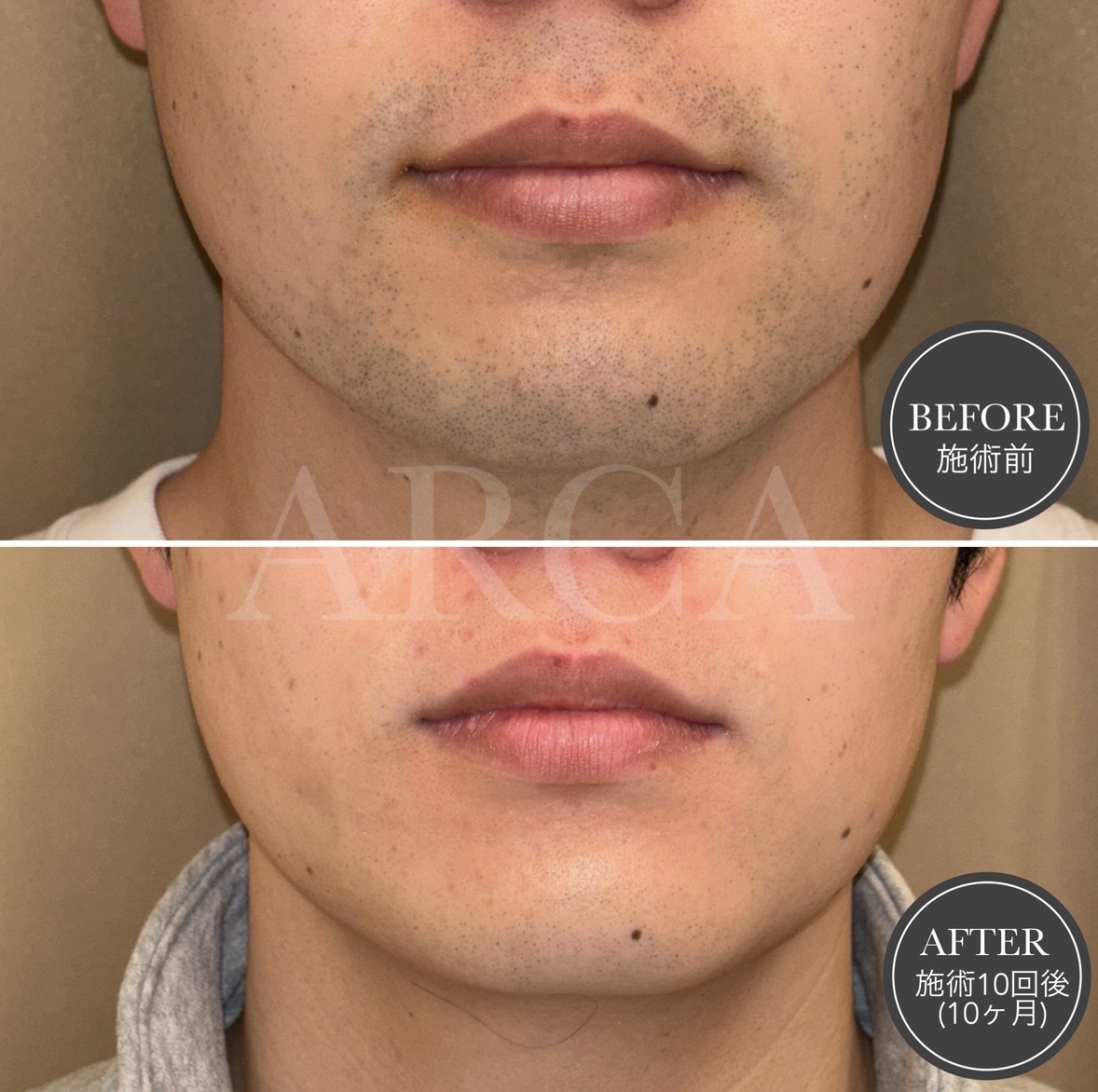 ヒゲ脱毛を月1回ペースで10回施術。徐々にヒゲが減り、肌に透明感が出て清潔感のある印象へと変化しました。