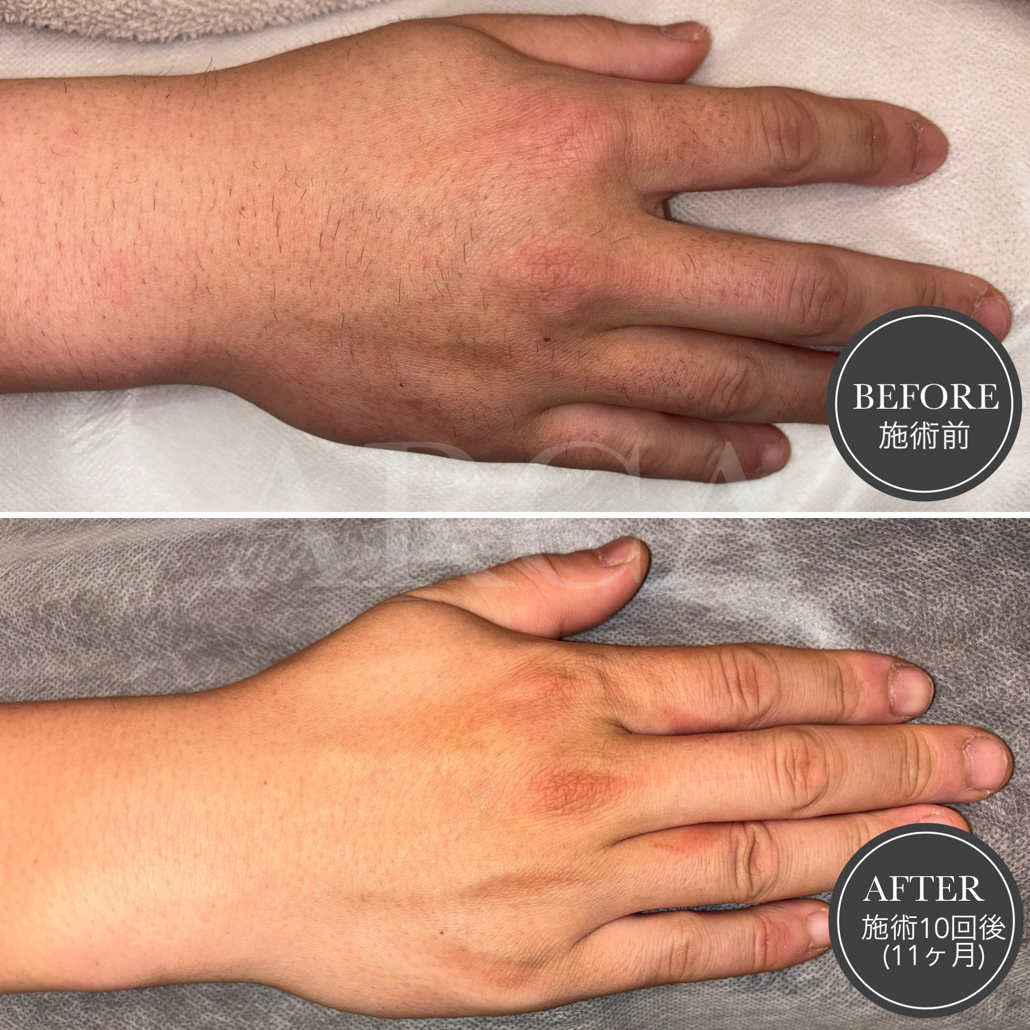 手の甲と指先の脱毛回数を重ね毛は細く、毛穴の目立ちも少なくなり、清潔感のある見た目に仕上がりました。細かいところの自己処理をせずに良くなり「すごく楽になった」と喜んでいただけました。