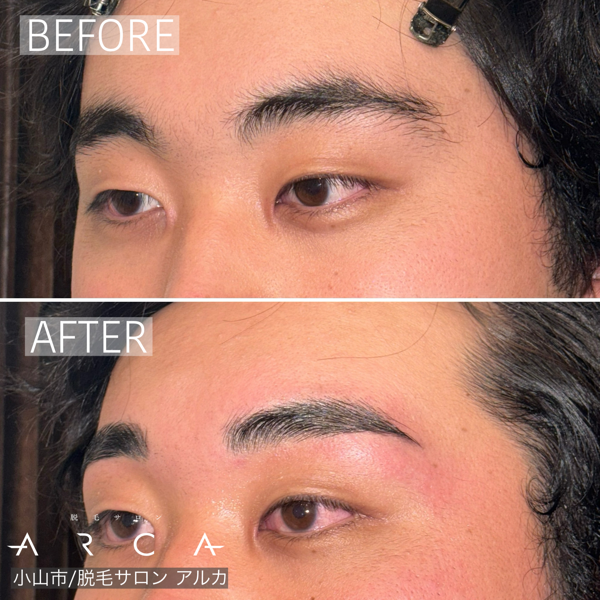 そのため、眉山部分の毛を重点的に立ち上げ、下がり眉にみえないように眉の形を改善しました。困っているようにみえた眉毛も、キリッと男らしい眉毛に仕上がり印象が変わりました。
